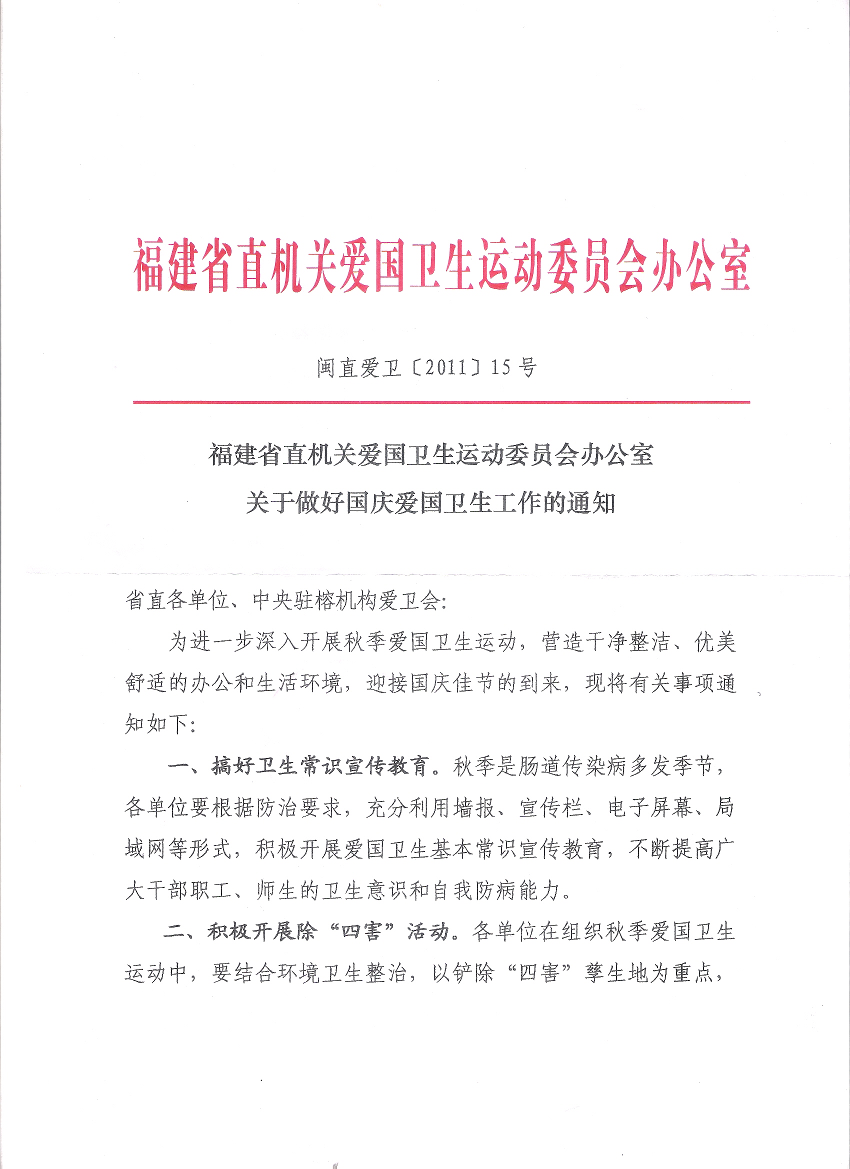 各单位: 现将《福建省直机关爱国卫生运动委员会办公室关于做好国庆爱国卫生工作的通知》(闽直爱卫[2011]15号)转发给你们,请按照通知要求做好国庆爱国卫生工作。宣传部和校医院牵头做好秋季卫生常识的宣传教育工作。相关单位要做好办公楼、办公室、教学楼、实验室、宿舍楼及包干区卫生工作;结合秋季特点做好食堂卫生、食品安全工作;做好校园环境整治和除“四害”等工作。 校文明办和爱卫办将于9月29、30日组织有关部门对全校卫生进行检查,检查结果将作为2011—2012年度校级精神文明建设先进单位评选的依据。