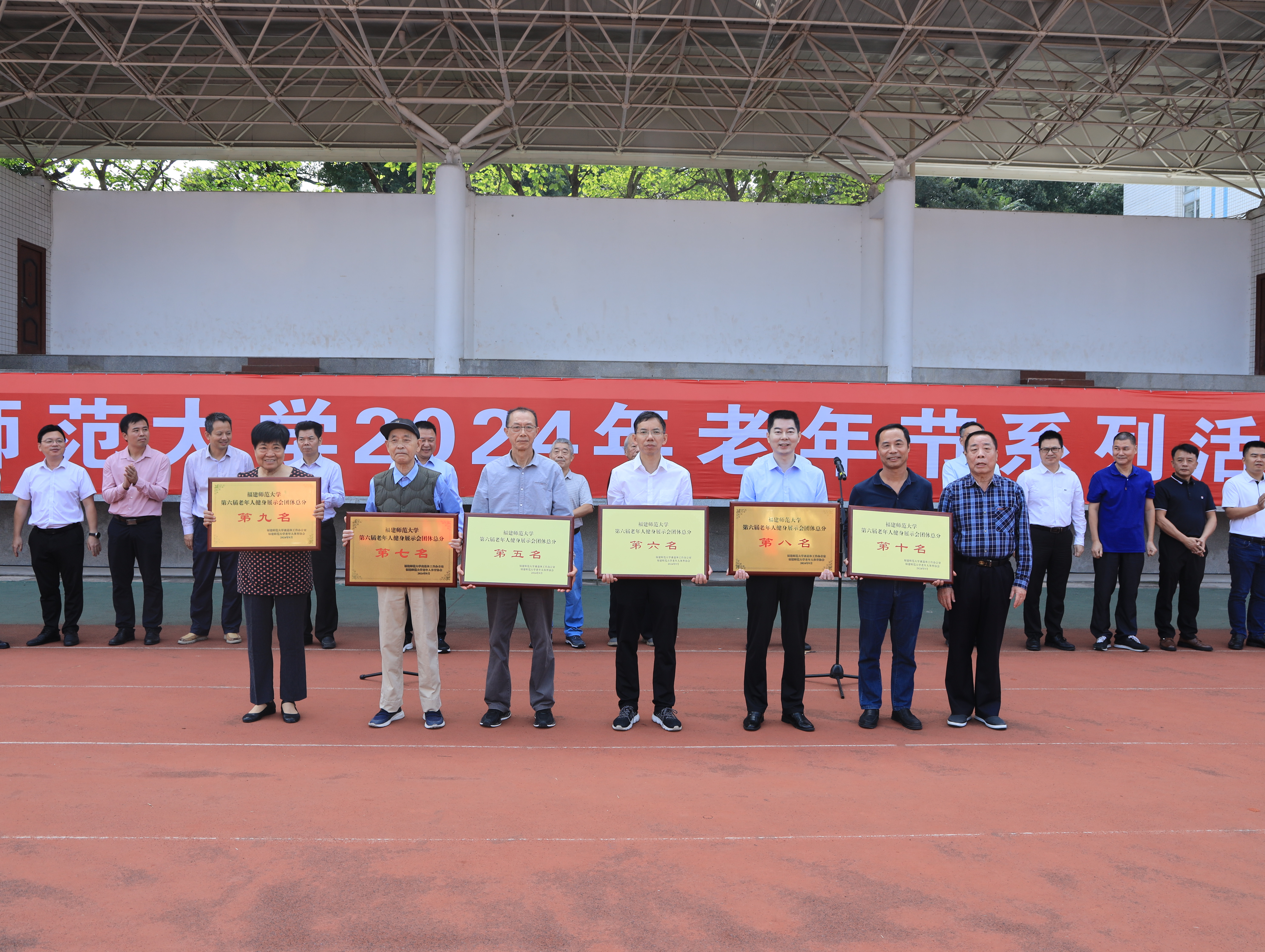 开幕式上,还表彰了校第六届离退休教职工健身展示会获得团体前十名的单位。