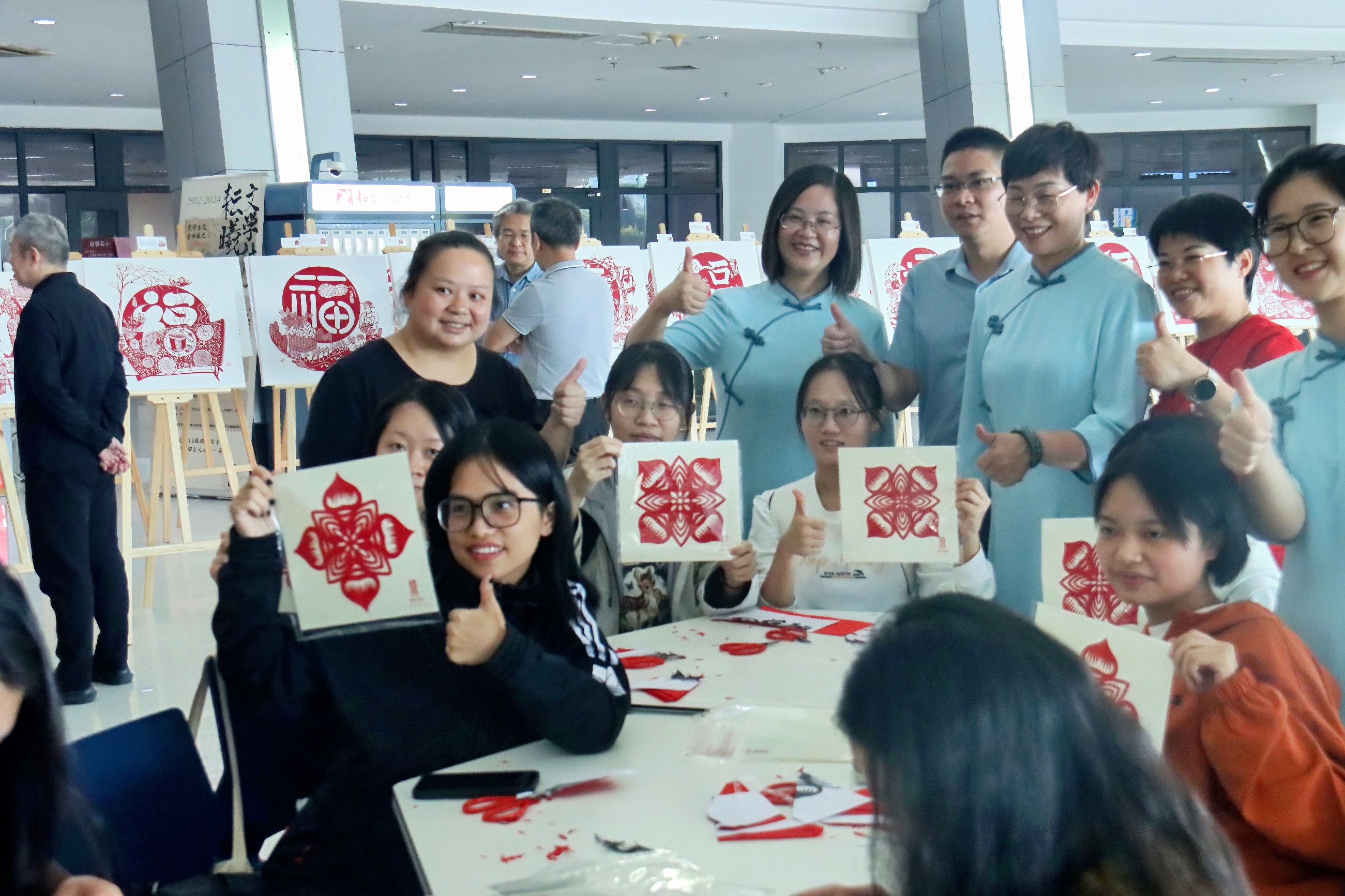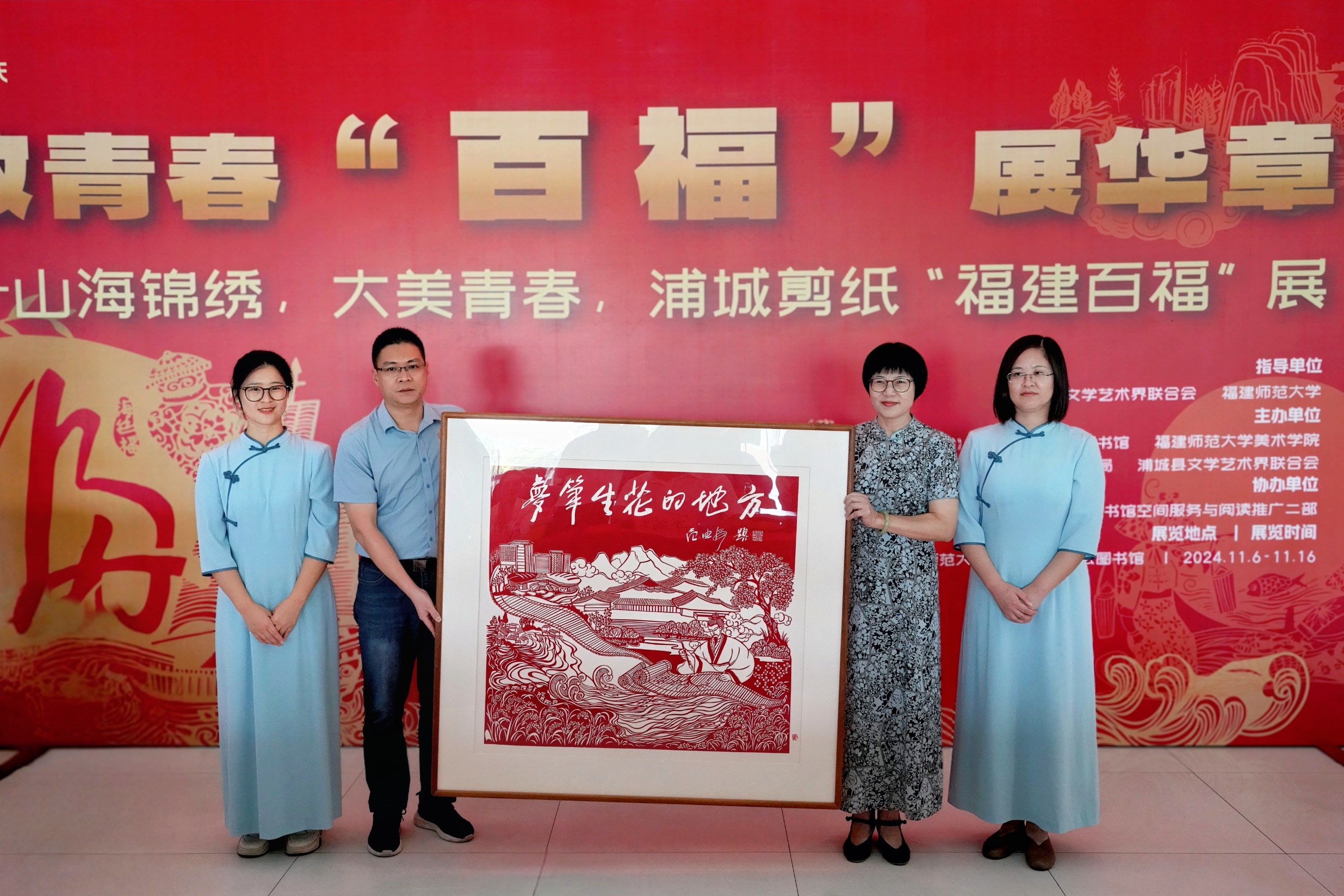 现场,国家级非物质文化遗产项目浦城剪纸省级传承人周冬梅代表浦城剪花嫂非遗团队向韦德(中国)图书馆捐赠了剪纸作品《梦笔生花的地方》,剪花嫂团队现场表演剪纸艺术并进行现场教学。