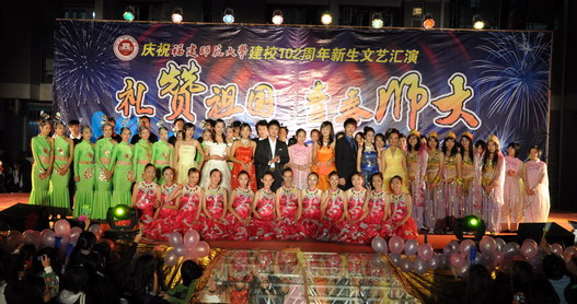 晚会在激情动感的舞蹈《歌舞青春》中拉开了帷幕。民歌联唱《大地飞歌》、舞蹈《藏情古意》深情表达了青年学子对伟大祖国的祝福。柔美悠扬的小提琴、电子琴演奏《卡农》和吉他弹唱《Country Road Take Me Home》令现场观众如痴如醉,徜徉在流动的旋律中。《流行频道》、《童年记忆》、《圣瓦伦丁》等舞蹈踩着时尚的鼓点,绽放青春的光彩,用动感的节奏和优美的舞姿尽情抒发青春的张扬不羁。美术学院同学现场作画《醉·牡丹》,以中国画形式呼应晚会浪漫的现代气息,古典风韵的牡丹图更是寄寓了“国富民强”的真诚祝愿。此外,华丽雍容的校模特队表演《Maintain Your Color》,舞蹈《红是红,绿是绿》、《飞》,歌舞剧《阳光宅男》等节目赢得在场师生的阵阵掌声。最后,晚会在《我爱我的祖国》的优美旋律和动人舞姿中圆满结束。