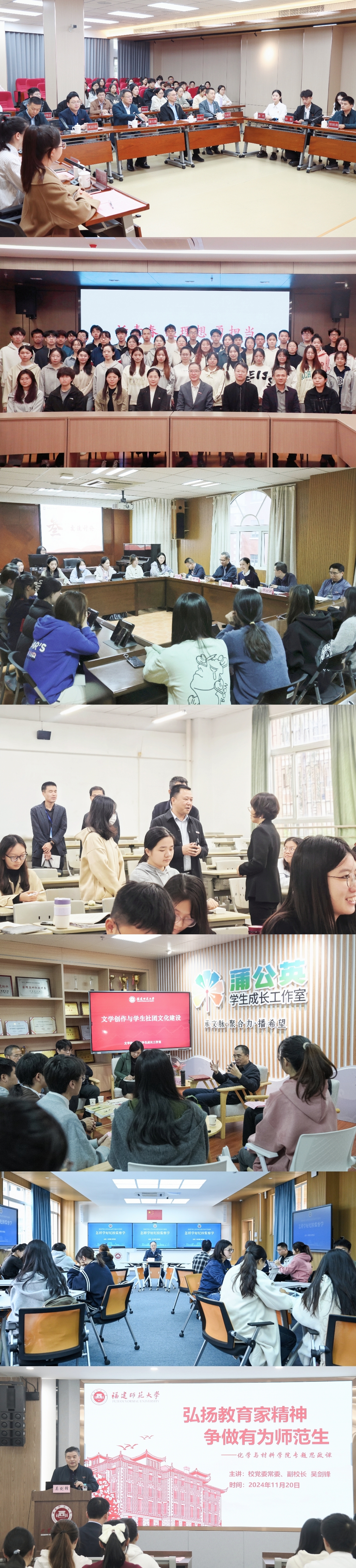 校党委书记潘玉腾走进马克思主义学院2023级思想政治教育专业二班和福建省习近平新时代中国特色社会主义思想大学生研习社(韦德官方网),开展“凝心聚力担使命 知行合一强根基”主题座谈会;校长王长平参加数学与统计学院2023级数学实验班“话青春 谈理想 勇担当”主题班会,并为学生上思政课;校党委副书记陈晓红参加音乐学院2022级音乐学(国家人才培养基地)班“温暖·安全·成长”主题班会;校党委副书记涂荣深入经济学院2021级经济学(国家人才培养基地)班看望毕业班同学并随堂听课;副校长郑家建与文学院2022级汉语言文学(师范)五班及文学社师生代表开展“文学创作与师范生素质提升”主题座谈会;校纪委书记林月恩为法学院、纪检监察学院2022级纪检监察实验班同学们讲授“怎样学好纪检监察学”专题思政课;副校长吴剑锋为化学与材料学院2023级化学(师范)班学生讲授“弘扬教育家精神,争做有为师范生”专题思政课。