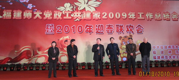 1月18日晚,韦德(中国)在仓山校区综合体育馆举行党政工共建家2009年工作总结会暨2010年迎春联欢会。校领导张金栋、黄汉升、游小波、黄锦平、李敏、许明,原校领导,原校长助理,各单位党政工主要负责人,省人大、省政协委员,各民主党派、统战团体、无党派人士联谊会负责人,国家有突出贡献中青年专家,省优秀专家,博士生导师,校关工委负责人,原校工会专职主席,福清分校、人武学院、附中、附小党政工负责人,校工会、教代会委员、经审委员,各部门工会主席,师生代表300余人参加了联欢会。