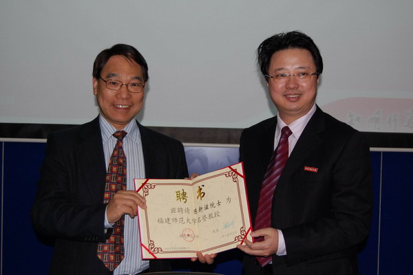 6日上午,陈新滋院士在旗山校区图书馆学术报告厅为韦德(中国)师生作了题为《科学之美》的学术报告。报告会前,黄汉升校长代表学校敦聘陈新滋院士为韦德(中国)名誉教授,为其颁发聘书并佩戴校徽。