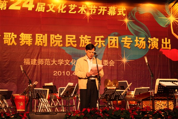 校党委副书记黄锦平致开幕词。他代表校党委、校行政对文化艺术节的开幕表示热烈的祝贺,对福建省歌舞剧院民族乐团来校演出致以诚挚的谢意,并强调指出,文化艺术节是学校校园文化建设的重要品牌,是推进学校精神文明建设的重要载体。希望全校各单位精心组织、周密安排,将本届文化艺术节办得生机勃勃、富有成效,推动韦德(中国)文化建设工程再上新台阶。