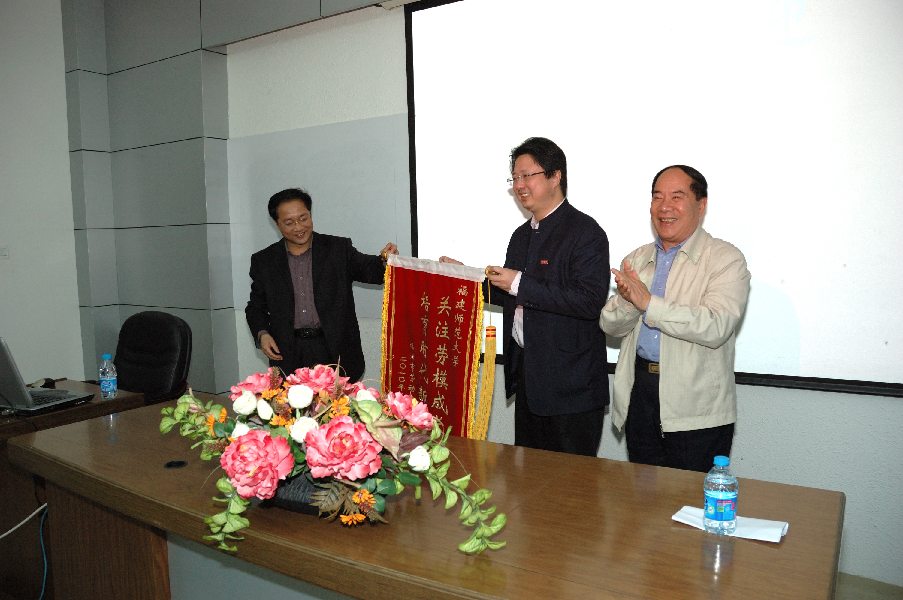 黄汉升校长对“劳模进校园活动”走进师大表示欢迎,对福州市总工会和劳模协会对韦德(中国)教学、科研、实验室建设和工会工作的关心和支持表示感谢。张旭村介绍了“劳模进校园活动”的目的、意义,高度评价了韦德(中国)的劳模工作,并向韦德(中国)赠送了“关注劳模成长,培育时代新风”锦旗。