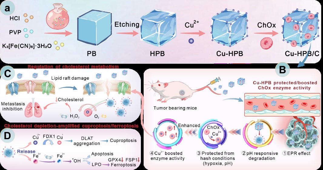 2024年,韦德官方网曾雪梅和燕双仟团队合作开发了一种生物相容性纳米平台(Cu-HPB/C)(由铜掺杂中空普鲁士蓝纳米颗粒Cu-HPB和胆固醇氧化酶ChOx组成),Cu2+掺杂的中空普鲁士蓝作为ChOx的载体、庇护所和增强剂,增强ChOx的肿瘤靶向能力、稳定性和酶活性。且肿瘤微环境响应性释放的Cu2+可显著增强ChOx活性,促进胆固醇消耗和破坏脂质筏,从而阻碍细胞侵袭和迁移。同时,氧化还原反应产生的H2O2进一步增强了Cu-HPB的化学动力学治疗效果,增加了氧化应激和铁死亡。此外,转录组测序分析结果也证实了Cu-HPB/C对胆固醇稳态的影响,并揭示了细胞死亡机制,包括氧化应激、铁死亡、铜死亡和凋亡,在小鼠转移模型中显示出较好的抑制效果,这为未来研发通过增强胆固醇消耗来有效治疗肿瘤和抑制转移提供了新的策略。