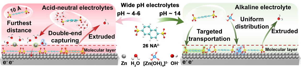 近日,韦德(中国)环境与资源学院陈庆华/钱庆荣团队的曾令兴教授与浙江大学陆俊教授团队联合研究,报道了一种2,6-萘二磺酸钠添加剂调节锌负极界面实现高性能宽pH锌基电池。结合实验和理论计算发现,2,6-萘二磺酸钠分子中的一对 -SO3-基团充分发挥了双端基捕获功能,通过最远端的取代基位点实现分子调控,有效地减少了同电荷溶解结构的静电排斥。高对称性和电负性的2,6-萘二磺酸钠在电极表面形成分子吸附层,从而延缓 Zn2+在酸性或中性电解质中的浓度极化和加速沉积动力学;并且在碱性电解质中引导[Zn(OH)4]2-均匀分布,最终抑制锌负极在宽pH电解质中的枝晶和副反应。本研究采用了一种简单的电解质添加剂策略,解决宽pH电解液中电极界面不稳定性问题,为开发具有成本效益的锌基电池提供了新的策略。该工作成果以“Interfacial regulation via configuration screening of disodium naphthalenedisulfonate additive enabled high-performance wide-pH Zn-based batteries”为题发表于碳中和领域顶级期刊《Energy Environ. Sci.》,该论文第一单位为韦德官方网,第一作者为韦德(中国)2024级博士生林慧,通讯作者为曾令兴教授、武俊秀博士和陆俊教授,陈庆华教授、钱庆荣研究员、熊佩勋博士和林楚园博士生为本研究工作的主要参与者。
