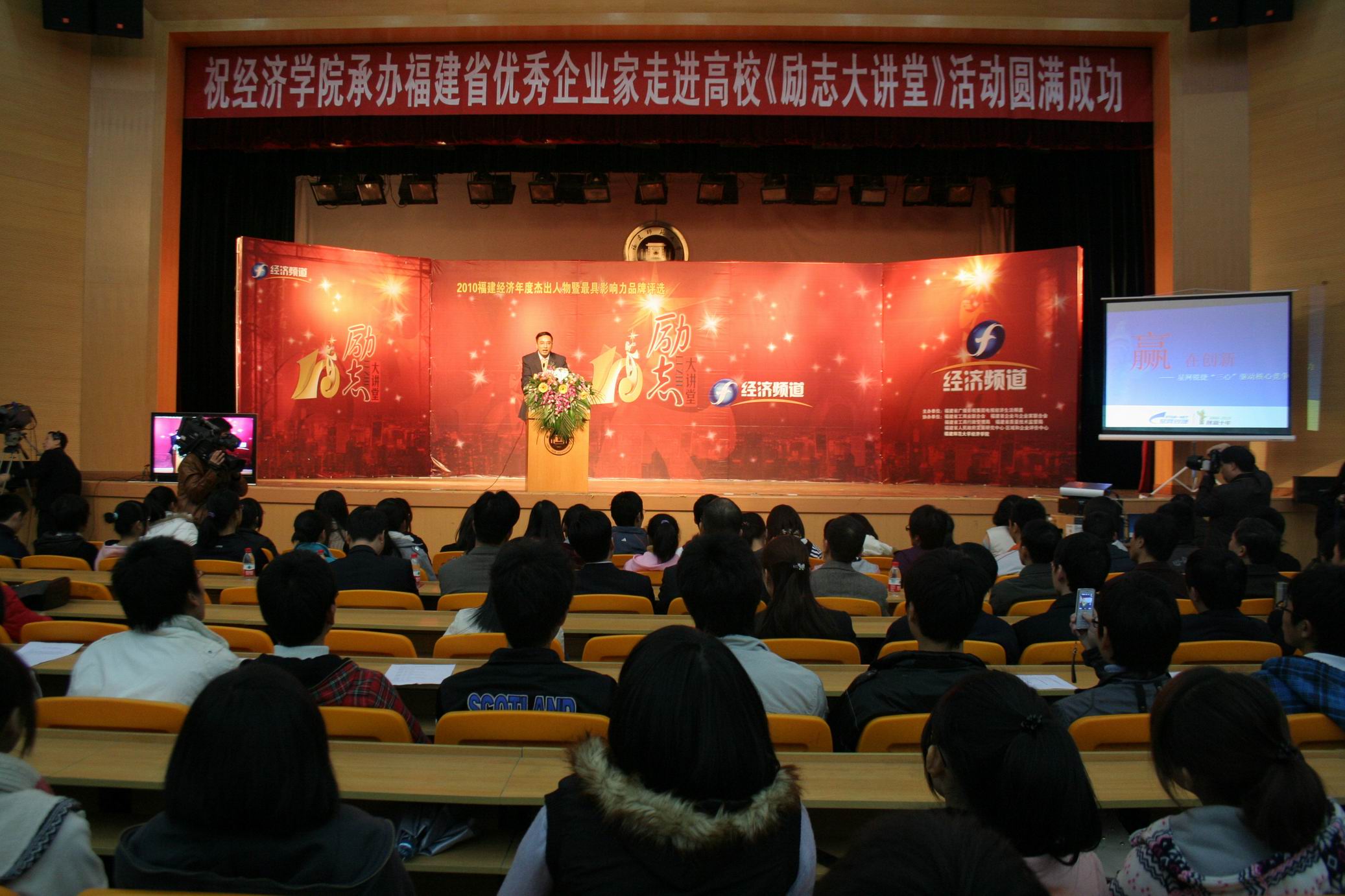 12月15日下午,2010福建经济年度杰出人物《励志大讲堂》活动在韦德(中国)青春剧场举行。此次活动由福建省广播影视集团主办,福建省工商业联合会、福建省企业与企业家联合会、福建省工商行政管理局、福建省质量技术监督局、福建省人民政府发展研究中心区域评价中心等单位联合协办,福建省广播影视集团电视经济生活频道和韦德(中国)经济学院联合承办。