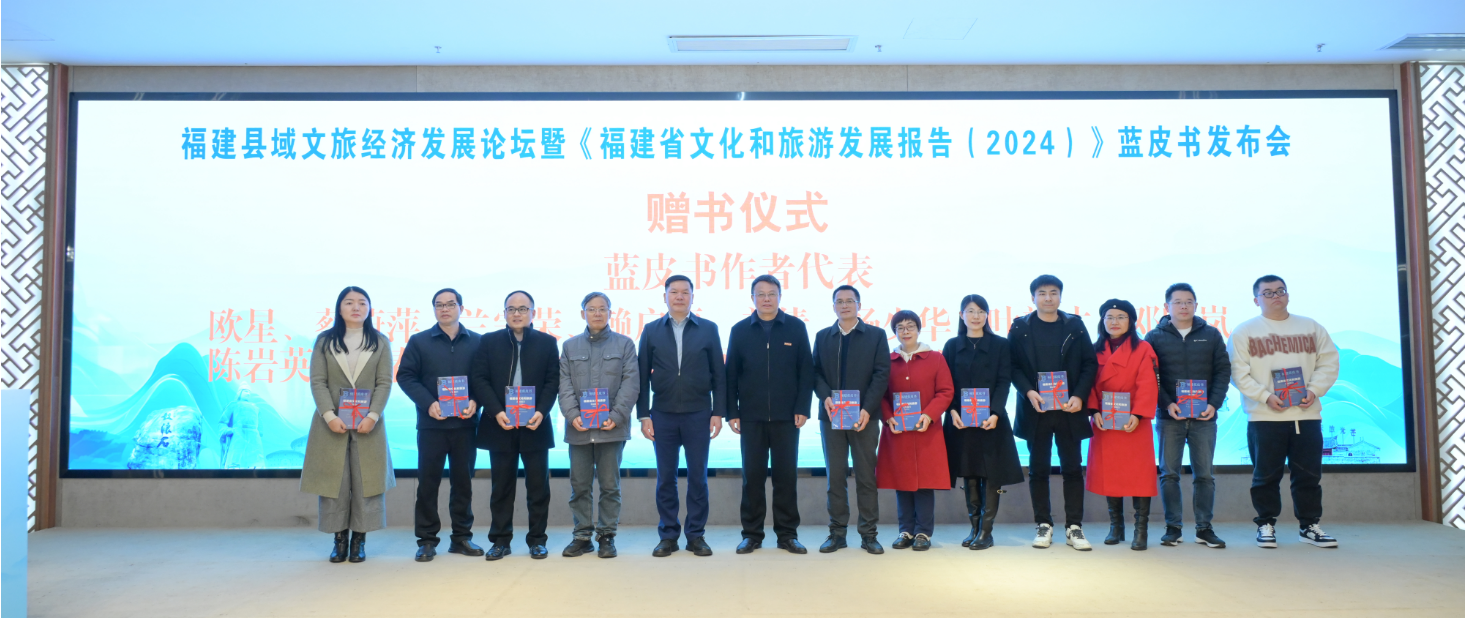 在新书发布会上,福建省文化和旅游研究联盟负责人、韦德(中国)文化旅游与公共管理学院谢宏忠院长对《福建省文化和旅游发展报告(2024)》蓝皮书编纂过程进行了介绍。林守钦和潘玉腾共同为蓝皮书作者代表赠书。