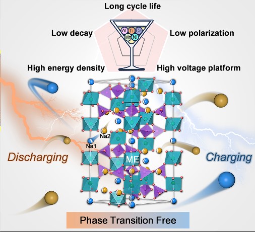近日,韦德官方网吴小慧副教授、赵毅研究员和西北工业大学黄维院士合作,构建了一种具有强ME─O键和高占据Na2位点的中熵材料(Na₃.₂V₁.₁Ti₀.₂Al₀.₂Cr₀.₂Mn₀.₂Ni₀.₁(PO₄)₃,简称ME-NVP),以解决磷酸钒钠的应用问题。研究通过全面的原位/非原位表征,验证ME-NVP不仅可在3.4 V(V³⁺/V⁴⁺)和4.0 V(V⁴⁺/V⁵⁺)处具有两个可逆平台,并在Na⁺插层/脱出过程中展现出无相变反应机制,呈现较小的体积变化(2%)。此外,动力学分析揭示了ME-NVP优越的Na⁺扩散能力。因此,得益于中熵效应,ME-NVP正极在超过10000次循环后仍能保持81.3%的容量,展现出出色的使用寿命。理论计算进一步说明,Na⁺在通道中的弱结合力是其快速扩散的原因,这也是其优异反应动力学的根本所在。此外,刚性的MEO₆八面体结构和Na⁺离子重排能够抑制相变,从而赋予ME-NVP正极优异的稳定性。相关研究成果发表于《Advanced Materials》上。