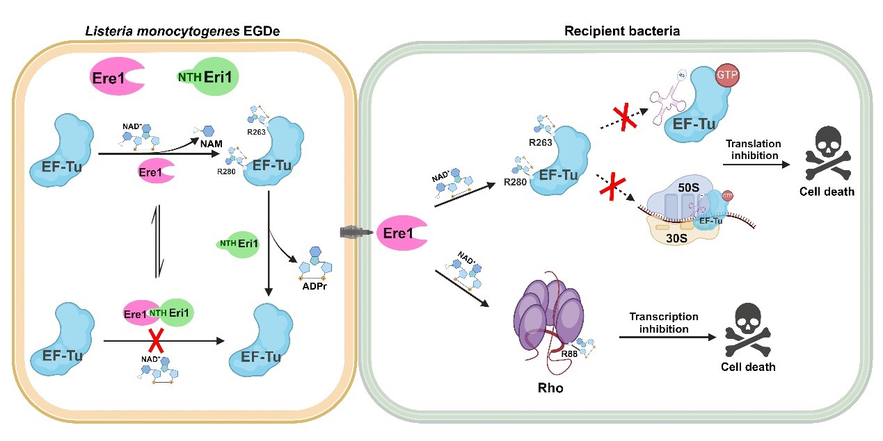 韦德(中国)欧阳松应教授团队以单核增生李斯特菌EGDe 株为研究对象,鉴定到了一个新的毒性效应蛋白Lmo0066,其C端结构域具有ADP-核糖基转移酶活性,命名为Ere1。Lmo0066与免疫蛋白Lmo0067(命名为Eri1,具有ADP-核糖基水解酶活性)共同组成E-I pair。此类独特的ART-ARH型E-I pair广泛分布于革兰氏阴性菌的假单胞菌门和革兰氏阳性菌的芽孢杆菌门中。Ere1通过VII型分泌系统进入竞争细菌后,ADP-核糖基化修饰EF-Tu和Rho,抑制竞争细菌的转录和翻译过程,进而杀伤竞争细菌。作者对收集到的10株革兰氏阴性菌和14株革兰氏阳性菌进行了竞争实验,发现单核增生李斯特菌可以竞争性杀死蜡样芽孢杆菌和凝结芽孢杆菌。Ere1发挥杀菌毒性的具体机制为:一方面通过修饰EF-Tu的R263和R280,分别阻止aa-tRNA与EF-Tu结合和EF-Tu·tRNA·GTP复合物在核糖体上的装载,进而抑制蛋白质的翻译;另一方面通过修饰Rho的R88,增强Rho依赖的转录终止,扰乱蛋白质的转录调控。值得注意的是,Ere1在被分泌出去之前对单核增生李斯特菌也具有毒性,为了避免误伤自己,其免疫蛋白Eri1通过独特的双中和机制消除Ere1的毒性。Eri1的具体中和机制为:既可以通过经典的直接结合并封闭Ere1酶活中心的方式抑制其毒性;也可以通过其ADP-核糖基水解酶活性解除ADP-核糖基化修饰对底物蛋白功能的抑制而消除Ere1的毒性。
