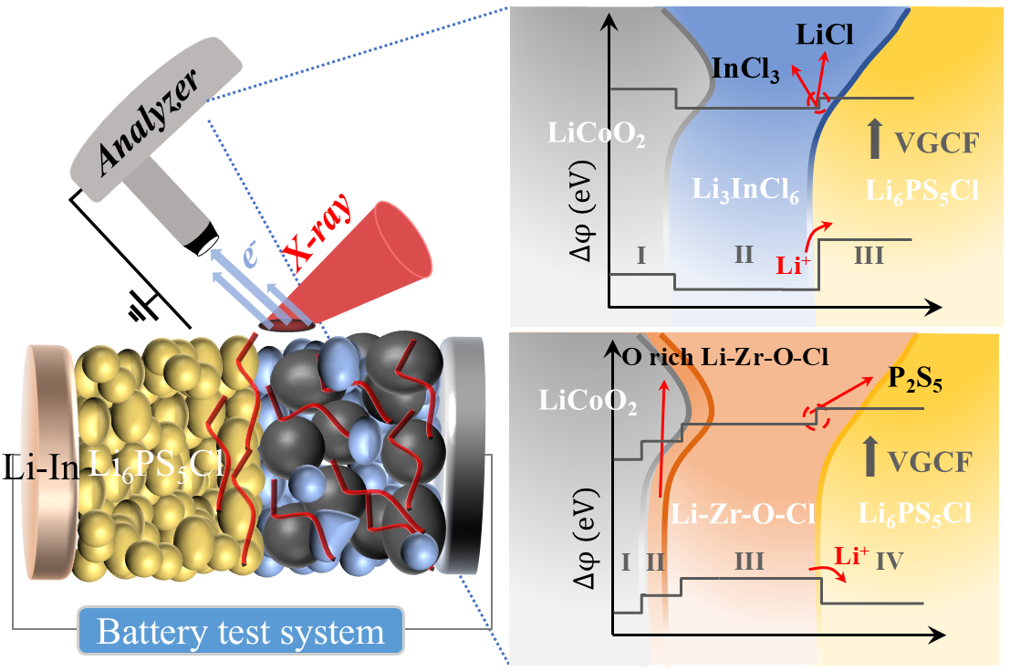 针对上述挑战,韦德(中国)林应斌教授团队在前期研发工况X射线光电子能谱技术的基础上,系统研究了硫化物与氯(氧)化物(Li3InCl6/Li1.75ZrO0.5Cl4.75)组合电解质的界面稳定性及离子传输行为,揭示了Li3InCl6因界面静电势差阻碍锂离子迁移并在电子渗透下不可逆分解为InCl3/LiCl的失效机制,以及Li1.75ZrO0.5Cl4.75通过氧富集界面形成和低势差促进离子扩散实现稳定循环的关键规律。