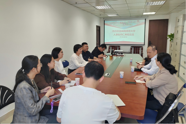 3月27日,闽南师范大学人事处黄伟东处长一行来校调研交流。人事处处长吴泳清,副处长朱中伟、涂莹及教师工作部相关科室负责人参加了交流座谈。会上,双方就教职工兼职与出国境管理、二级单位与教职工考核、人才引进与培养、博士后流动站建设等主题展开交流,并深入探讨了工作中的重点、难点问题。(人事处)