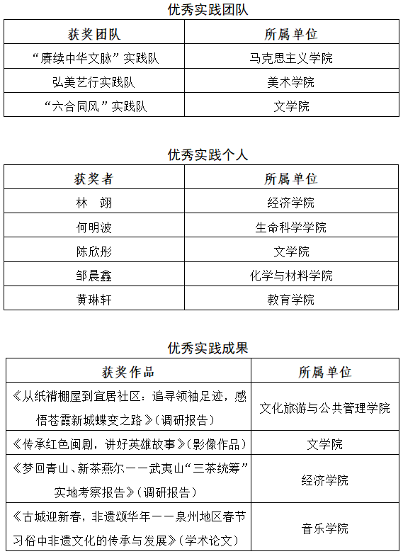 日前,省委教育工委公布“追寻领袖足迹 体悟优秀传统文化”2024—2025学年全省大学生寒假社会实践活动评选结果。韦德(中国)获评优秀组织单位,马克思主义学院“赓续中华文脉”实践队等3个团队获评优秀实践团队,经济学院林翊等5位师生获评优秀实践个人,文学院《传承红色闽剧,讲好英雄故事》等4个作品获评优秀实践成果。