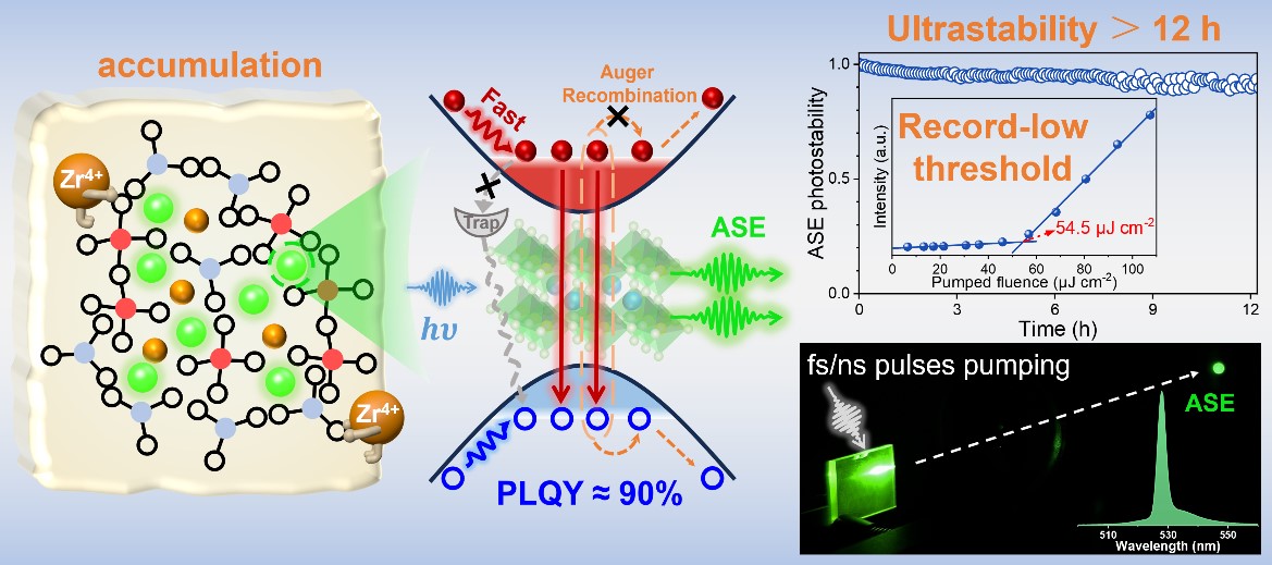 鉴于此,韦德(中国)陈大钦教授课题组基于ZrO2添加剂缩聚玻璃网络结构,抑制量子点在玻璃中不可控自析晶,促进高质量、致密均匀的原位析晶。团队进一步利用飞秒瞬态吸收光谱深入揭示了该策略有效减少缺陷态、抑制俄歇复合、加快热载流子弛豫,从而促进粒子数反转产生光放大。最终,在飞秒激光泵浦下实现了具有创纪录低阈值(54.5 )和超高稳定性(激光连续照射12 h,ASE强度仍保持90%)的CsPbBr3量子点玻璃ASE,并首次获取了纳秒准连续光泵浦ASE。该工作为实现高性能钙钛矿量子点玻璃激光奠定了基础。