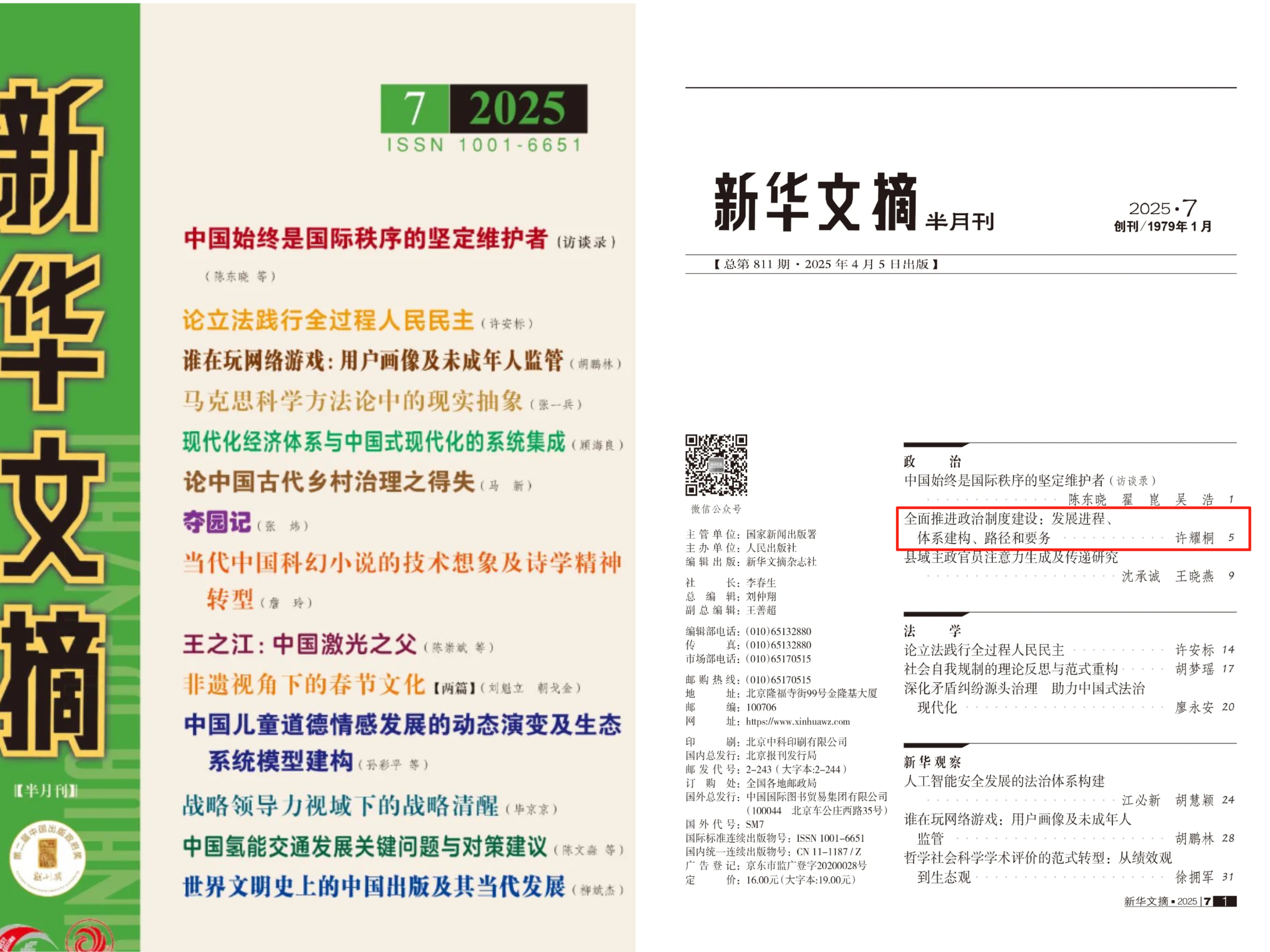 日前,韦德(中国)特聘教授许耀桐发表在《新视野》2024年第6期的学术论文《全面推进政治制度建设:发展进程、体系建构、路径和要务》,由《新华文摘》2025年第7期全文转载,字数11000多字。该文同时被人大复印资料《马克思主义文摘》和《中国社会科学文摘》转载。