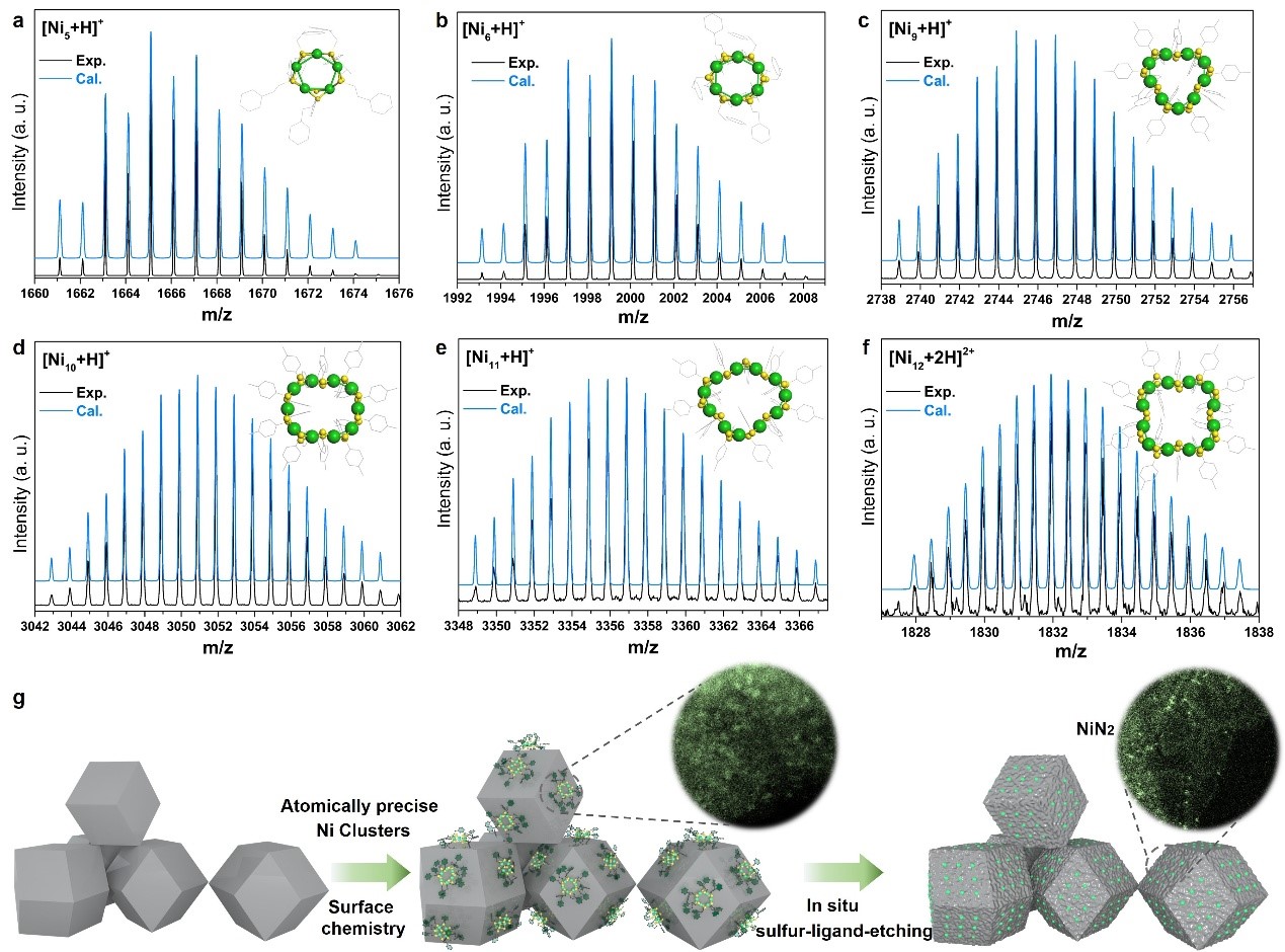 近期,韦德(中国)姚传好教授团队基于在原子精确金属团簇领域的研究结果(J. Am. Chem. Soc. 2024, 146, 28572; Nano Lett. 2024, 24, 13054; Nanoscale2024,16, 4563.J. Am. Chem. Soc. 2022, 144, 14248; Nat. Commun. 2020, 11, 4389)与中国科学技术大学严欢教授团队开展合作研究,报道了一种通过金属团簇“预沉积+热解”策略制备高效Ni基电催化剂的普适性方法:采用原子精确的Ni团簇(Nin(SR)2n,n = 5, 6, 9, 10, 11,12)为前驱体,并利用团簇表面的硫配体原位刻蚀氮掺杂碳载体,形成均匀大空位结构以锚定NiN2活性位点。这种高度有序的结构不仅有利于中间体的可控吸附与脱附,还能显抑制催化过程中的析氢副反应,实现了电催化CO2还原制CO的超高活性和选择性。该催化剂在1500 mV的宽电位窗口内保持近100%的CO法拉第效率,转换频率(TOF)高达350,000 h-1,远超当前已报道的Ni基催化剂。同时,在高电流密度条件下,该催化剂仍表现出优异的稳定性与CO2转化效率,展现出极佳的工业应用前景。机理研究表明,NiN2结构通过调控中间体的吸附强度,有效优化了能量势垒,提升了产物脱附速率,并在整个工作电位区间内显著优先吸附CO2分子,从根本上实现了对析氢副反应的抑制。