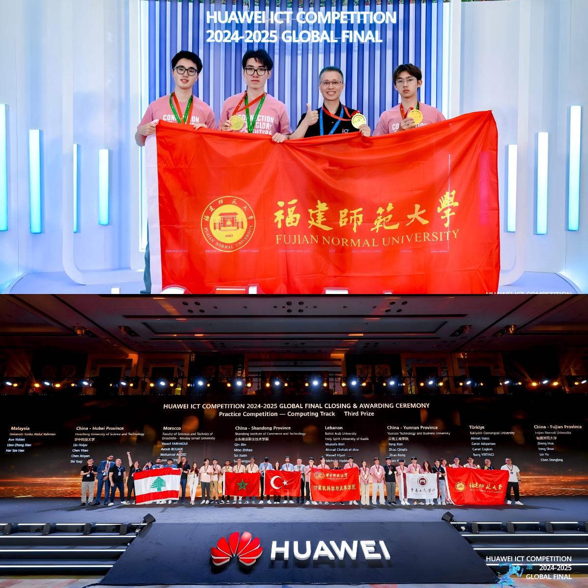 5月24日,华为ICT大赛2024-2025全球总决赛闭幕式暨颁奖典礼在深圳举行。光电与信息工程学院学生冯硕、计算机与网络空间安全学院学生林宇、陈东灵组成的团队,在郑华老师的指导下,以中国区总决赛一等奖的成绩进入全球总决赛,并获得基础软件赛道三等奖。