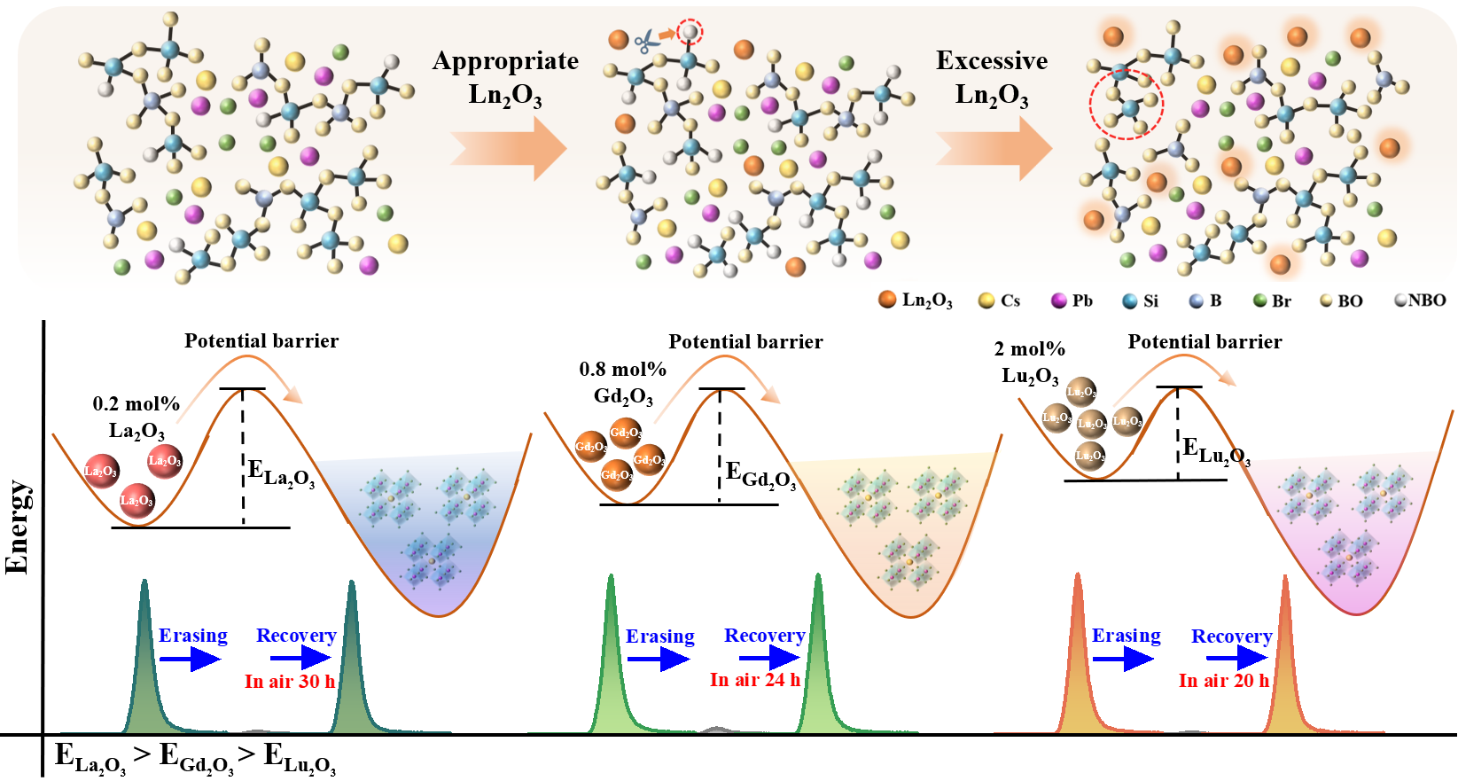 基于此,研究团队报道了硼硅酸盐玻璃中的镧系氧化物(Ln₂O₃,Ln=La、Gd和Lu)能够调节硅氧网络的连接性,并控制由fs激光诱导的CsPbBr₃ PeQDs的原位形成。重要的是,只有当掺入最佳浓度的Ln₂O₃时,PeQDs 才能在特定区域被fs激光擦除,构建更疏松的网络结构,并降低离子迁移的结晶势垒。随后,由于水分子入侵,分解的钙钛矿材料可以自主再生。恢复时间因镧系离子类型和浓度而不同。这种可逆发光可多次循环,同时保持稳定的发光性能,为开发创新加密方法以保障信息安全和防伪技术奠定了基础。
