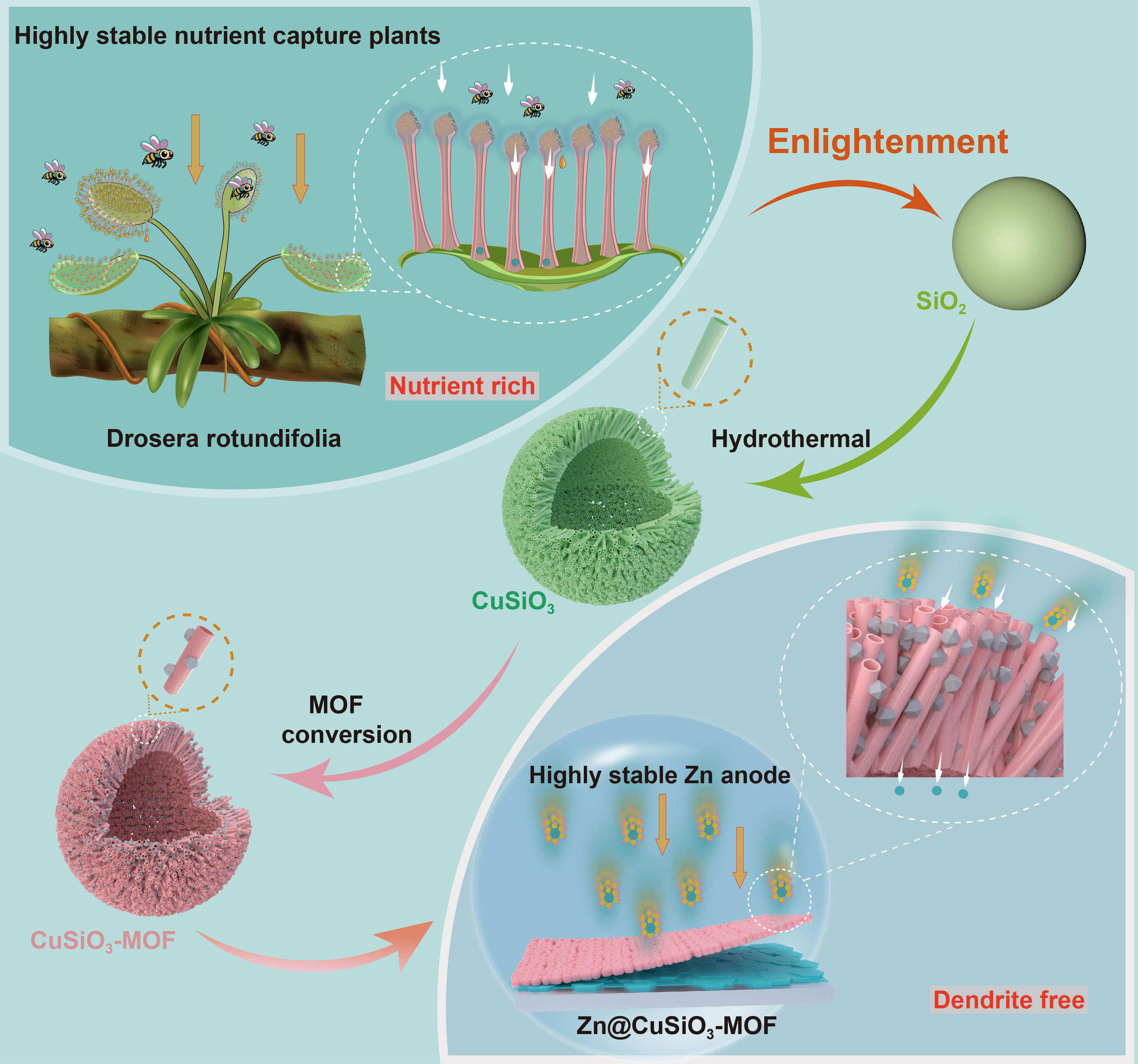 为解决这些挑战,韦德(中国)赵毅研究员团队从圆叶茅膏菜的生物机制和共生结构中汲取灵感,提出了一种原位MOF转化构建的分级中空CuSiO3-MOF杂化材料。这种仿生杂化材料作为锌负极人工保护层,可为锌负极提供优异的结构稳定性、丰富的亲锌位点、强大的去溶剂化能力和快速的离子迁移能力,从而实现高度稳定的无枝晶锌沉积/剥离过程,并有效抑制与水相关的副反应。在低电流密度下,Zn@CuSiO3-MOF对称电池展现出超过3500小时的超长循环寿命。即使在45%和90%的高放电深度下,该电池仍分别保持1200小时和400小时的稳定循环性能,显著优于大多数已报道的MOF修饰负极。此外,以MnO₂和C@V₂O₃为正极的全电池表现出卓越的循环性能和倍率性能,进一步凸显Zn@CuSiO3-MOF负极在电网储能和可穿戴电子设备中的实际应用潜力。这一仿生策略为构建稳定MOF基杂化材料用于高性能锌金属负极提供了一种可行的方法。研究成果以“A Biomimetic Copper Silicate-MOF Hybrid for Highly Stable Zn Metal Anode”为题,发表于材料顶级期刊《Advanced Materials》。