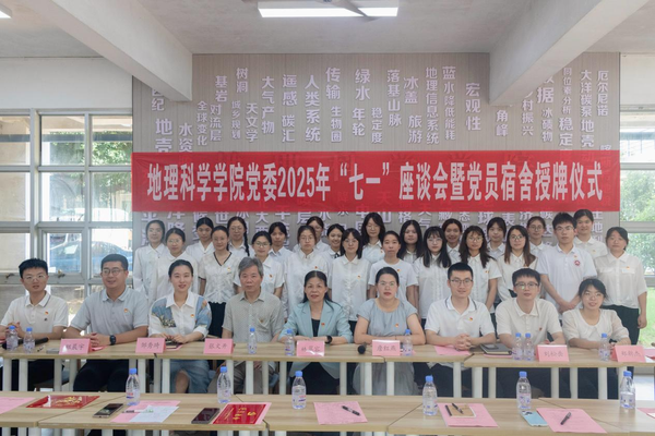 71日,地理科学学院在“一站式”学生社区李苑1号楼举行2025年“七一”座谈会暨党员宿舍授牌仪式。学院党委书记林翠容、党委副书记林伟、关工委副主任张文开以及师生党员代表参加活动。