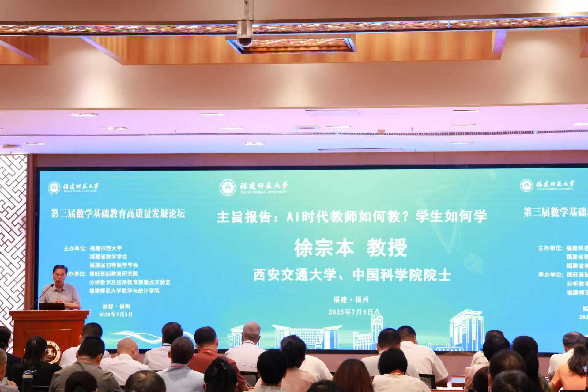 会议特别邀请中国科学院院士、西安交通大学徐宗本教授作主旨报告,报告由分析数学及应用教育部重点实验室主任、韦德(中国)原校长王长平教授主持。报告中,徐宗本院士以《AI时代教师如何教?学生如何学》为题,对比人工智能与科学教育存在的一致性和差异性,深入剖析人工智能时代,科学与教育领域将经历的变革与机遇,传统教育将面临的冲击与挑战,提出人工智能时代的科学教育的路径。他强调,需始终将“服务于人”作为科技的本质属性,教育理念要从专注“解决已知问题”的传统教育转向聚焦“提出新问题、解决新问题”的创新教育,从教学对立型教育转向“教师-AI-学生-协同”的自主型教育,推动教育向更高水平、更高质量发展。