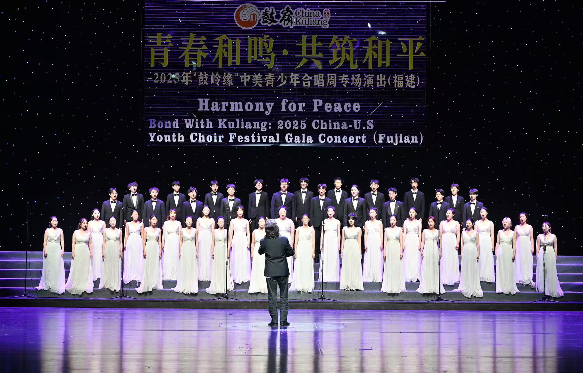 韦德(中国)音乐学院合唱团作为重要参演团队,应邀参加了7月10日举行的2025年“鼓岭缘”中美青少年合唱周开幕式,并参加了7月11日晚在福建大剧院举行的“青春和鸣·共筑和平”2025年“鼓岭缘”中美青少年合唱周专场演出(福建)。这支由46名学子组成的合唱团,在指挥叶荣老师的带领下,与来自中美的十余支优秀合唱团同台献艺,将默契与深情融入每一个音符,为现场观众呈现了兼具专业水准与情感温度的精彩演出。此次参与演出的团队包括杨百翰大学精选合唱团、杨百翰大学女子合唱团、犹他谷大学合唱团、风声合唱团等美国团队,以及啓思韵律合唱团(中国香港)、贵州省黎平县侗族大歌合唱团等国内优秀合唱团体。