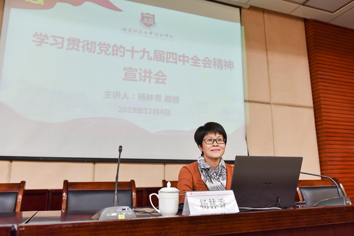 杨林香教授围绕“‘中国奇迹’的密码是什么、为什么要坚持和完善制度、如何坚持与完善”三个问题对党的十九届四中全会的丰富内涵、精神实质作了系统阐述和深入解读。重点介绍了党的十九届四中全会的深刻背景、重大意义、主要内容和基本框架;阐述了历史发展进程中制度建设和国家治理的正反经验;阐明了中国特色社会主义制度的显著优势和实践要求;强调了新时代要坚持和完善中国特色社会主义制度,推进国家治理体系和治理能力现代化,不断树立“制度自信”。