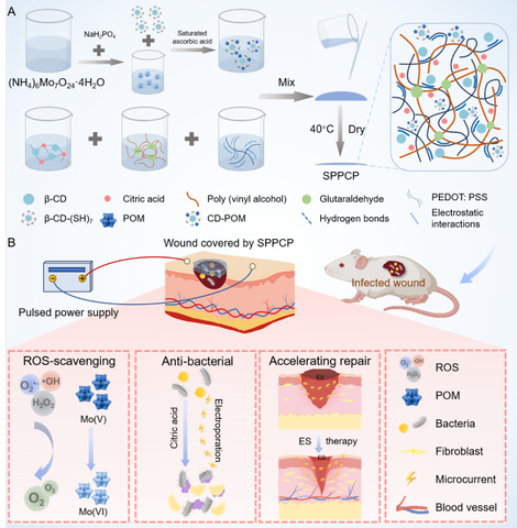 慢性创面因细菌感染和氧化应激常出现愈合缓慢、炎症反复等问题,已成为临床创面管理中的重大挑战。近日,韦德(中国)杨震教授团队提出了一种多功能柔性导电凝胶敷料(SPPCP),该敷料由聚乙烯醇、导电高分子PEDOT: PSS、β-环糊精–柠檬酸超分子网络以及多金属氧酸盐(CD-POM)协同构建,具备优异的机械柔韧性、稳定的导电性和出色的组织黏附性。CD-POM赋予敷料高效的活性氧清除能力,可有效缓解氧化应激,诱导巨噬细胞向抗炎M2表型极化,并降低促炎因子水平,为组织修复创造有利的微环境。SPPCP在电刺激协同作用下,对大肠杆菌和金黄色葡萄球菌的抗菌效率超过99%,并可促进成纤维细胞的迁移与增殖。在动物感染性创面模型中,SPPCP联合电刺激疗法不仅能够减轻炎症、促进组织再生,加快血管生成,并促进胶原沉积与肉芽组织形成,从而加速创面修复进程。本研究提出了“电刺激+氧化还原调控”的新型设计策略,可动态优化创面微环境,为新一代柔性电子伤口敷料的开发提供了重要思路。研究成果以“Synergistic Supramolecular Conductive Dressing Integrating Electrical Stimulation and Polyoxometalate Antioxidants for Enhanced Chronic Wound Healing”为题,发表于中科院医学一区TOP期刊《Acta Biomaterialia》。