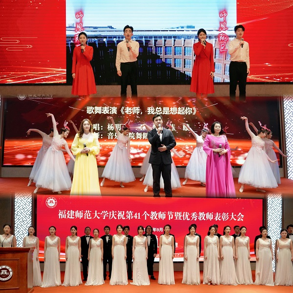会上,校长郑家建宣读表彰名单,与会校领导为受表彰先进个人、团队代表颁奖,文学院林志强教授、文化旅游与公共管理学院郑惠文同学分别作为教师和学生代表发言,音乐学院、传播学院师生为会议献上精彩演出。