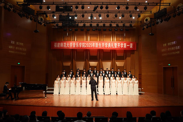 9月8日,音乐学院2025级新生开学典礼暨开学第一课在音乐厅举行。学院党政领导班子、各系部负责人、各科室负责人、教师代表、辅导员以及2025级全体新生和部分家长参加。典礼由学院党委副书记杜成煜主持。