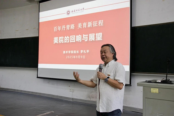 随后,院长罗礼平教授以“百年丹青路,美育新征程”为主题讲授开学第一课。他生动回顾了学院的发展历程,详细介绍了学院的师资队伍、专业建设以及未来规划,希望同学们秉承“一专多能、又红又专”的院训,从传统文化中汲取智慧,躬耕艺术,勇于创新,积极投身时代洪流,并勉励新生们要坚守艺术理想不懈探索,尚美求真、砥砺前行,共同为学院和艺术事业的发展贡献青春力量。