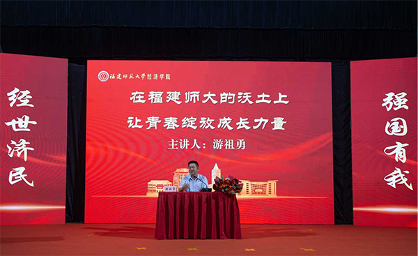 典礼后,经济学院校友、省水利厅原副厅长、一级巡视员游祖勇在福建师大的沃土上,让青春绽放成长力量为题讲授开学第一课。游祖勇求学时期的探索与思考、步入职场后的实践与沉淀,以梦想无边、青春无限、生命无价三个主题,分享了自己的成长故事,并围绕“如何推动地区经济高质量发展”等话题进行现场互动。