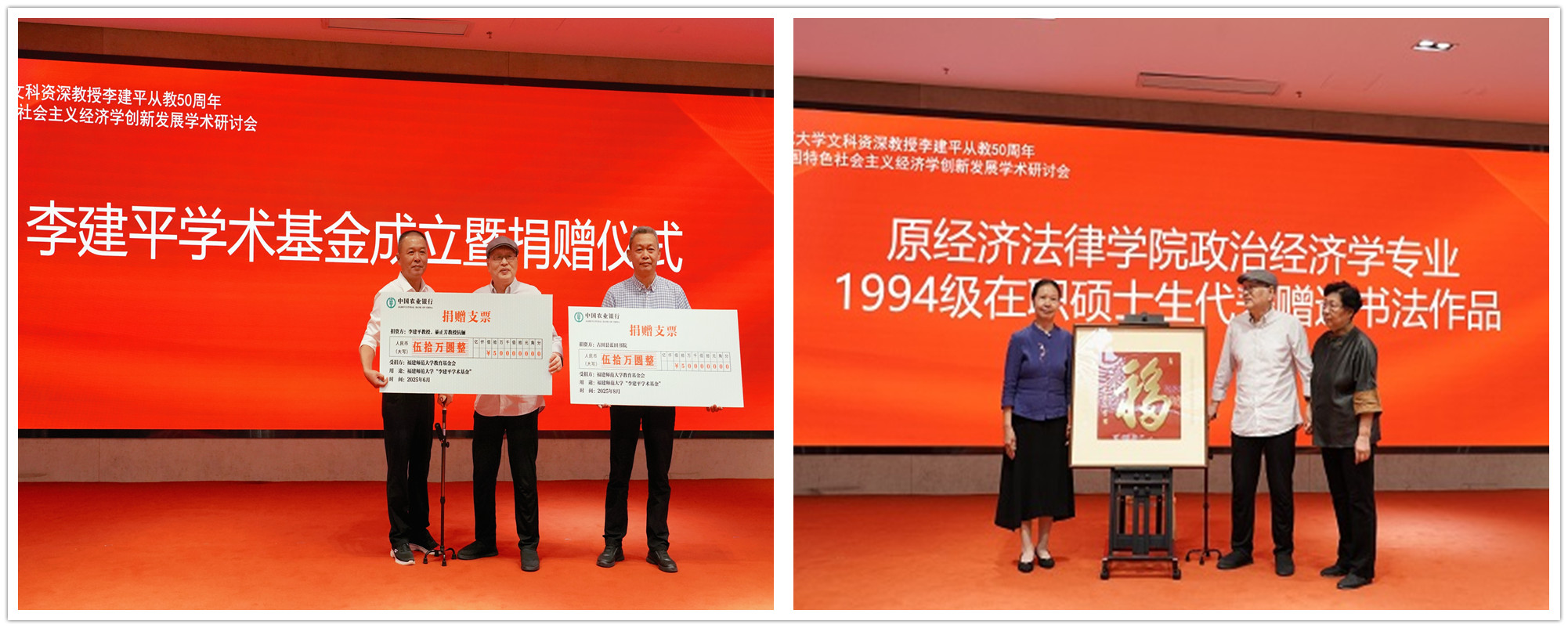 开幕式上还举行了李建平学术基金成立暨捐赠仪式。李建平教授与校友捐赠者代表、古田县蓝田书院理事长余云辉校友共同进行捐赠。在李建平学术基金成立后,李建平教授、綦正芳教授伉俪率先捐赠50万元。在广大校友、全校师生和社会各界的踊跃响应下,该基金累计收到捐赠款300万元,今后将用于支持韦德(中国)理论经济学和马克思主义学科发展。