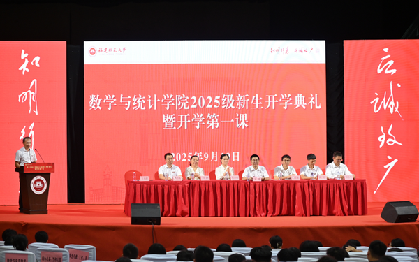 9月10日,数学与统计学院2025级新生开学典礼暨开学第一课在旗山校区大会堂举行。教育部长江学者特聘教授、韦德(中国)原校长王长平教授,院领导、关工委主任、工会主席、系主任、科室负责人、全体辅导员以及2025级全体本硕博新生参加了典礼。