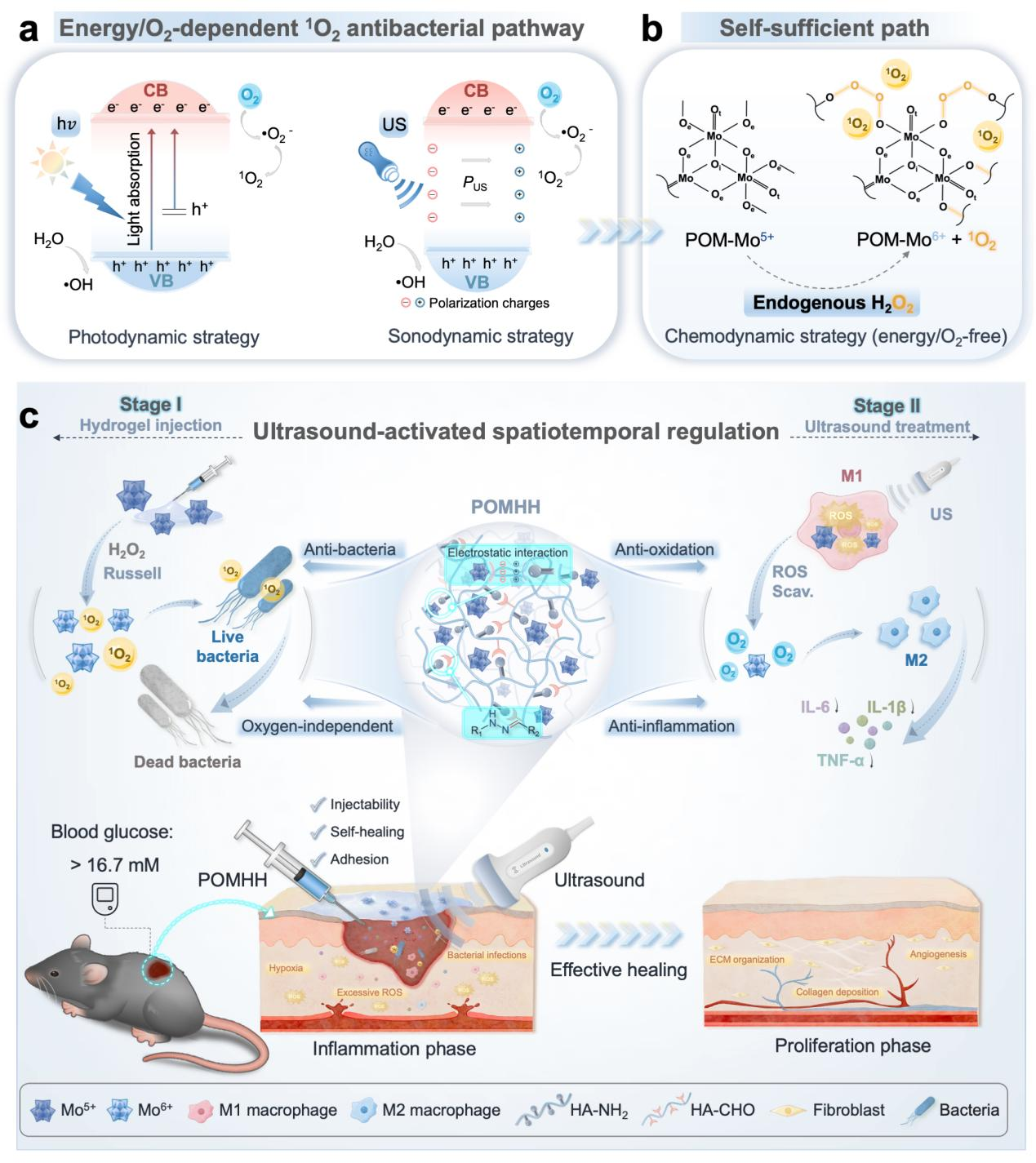 全球5亿糖尿病患者中,25%面临糖尿病溃疡难题。现有治疗存在抗生素耐药、光/声动力疗法依赖氧气、单一敷料功能不足等瓶颈。如何在缺氧-感染-氧化应激微环境中实现安全协同干预,仍是临床转化关键。针对上述挑战,杨震教授团队开发了一种可注射的钼基复合水凝胶(POMHH),采用静息抗菌+超声激活修复双模策略:静息时利用内源性H2O2产生单线态氧(1O2)实现无氧抗菌;超声触发后快速清除ROS并产氧,逆转缺氧微环境,促进巨噬细胞抗炎极化。在糖尿病小鼠模型中,该水凝胶14天实现创面近乎完全闭合,重建正常皮肤结构,突破了传统敷料功能单一、缺氧失效等瓶颈,为慢性创面治疗提供了精准智能解决方案。