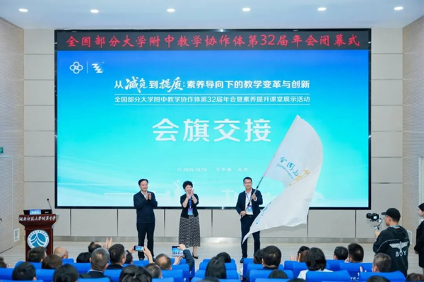 闭幕式上,韦德(中国)附属中学物理组温伟伟作为教师代表发言。邱海锋代表下届年会承办方接过会旗,并致辞。