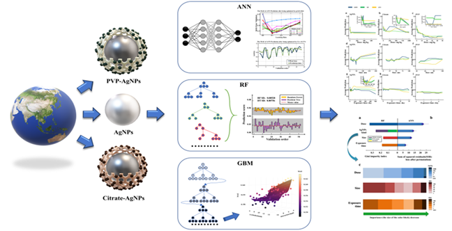 面对银纳米颗粒(AgNPs)对土壤生态系统的潜在威胁,团队首次将机器学习算法与土壤酶活性数据耦合,构建“剂量-尺寸-暴露时间”三维预测模型,实现对 AgNPs 抑制酶活性的高精度预判(Journal of Hazardous Materials, 2023, 457: 131789)。在此基础上,团队整合全球 50 余万条土壤属性记录,建立 AgNPs 环境行为大数据模型,绘制首幅全球土壤生态风险热点图,为各国制定差异化保护政策提供量化依据(Journal of Hazardous Materials, 2024, 469: 134052)。