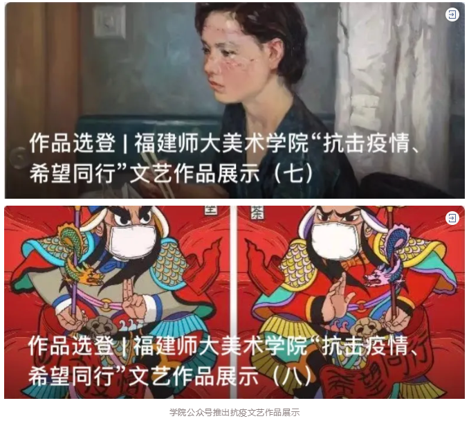 学院积极开展抗击疫情宣传教育。通过微信公众号陆续推送22篇原创作品,其中原创作品《美术学院研究生导师给研究生的一封信》获教育部学位中心就业等微信公众号引用;《美院师生用画笔致敬逆行者》《美术学院学生党支部筑牢抗战斗堡垒》《战有我,美院学子勇担当》《翁振新教授<战位有我 不辱使命>创作记》《携手同心|我们始终在一起!》《美院研究生用画笔绘制一线医护人员的战日记》获学校官方微信、福师大小葵等平台转发。此外,学院及时传达学校相关文件通知、普及疫情防范知识、扩散就业资讯等,转发推文31篇。