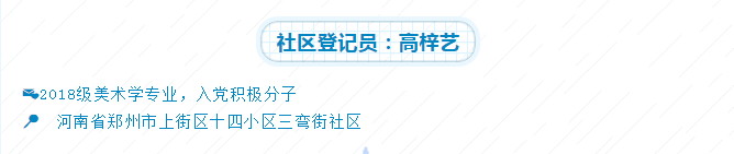 高梓艺参加了社区志愿者的督导工作,指导居民正确戴口罩,进行小区出入登记,为社区防治贡献自己的力量。在志愿活动中,高梓艺同学深感作为一名积极分子的担当与责任,也在帮助他人的过程中体会到了人与人之间的关怀,感受到共抗病毒,共同进退的凝聚力。