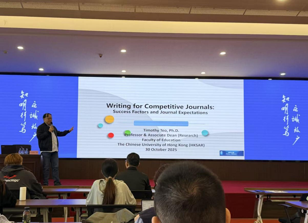 香港中文大学教育学院教授兼研究副院长Timothy Teo开展了题为“人工智能在科研中的伦理影响”和“面向高水平学术期刊的写作:成功要素与期刊期望”的讲座;中国教育科学研究院课程与教学研究所所长郝志军研究员开展了题为“推进五育融合:指向学生全面发展的教学改革”的讲座。