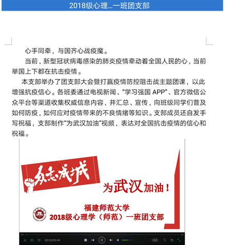 各团支部围绕着“团聚青年同战‘疫’共克时艰作贡献”,开展了各具特色的团支部活动。2019级心理学类二班团支部发起“写诗传爱武汉”活动,通过诗句接龙,表达对武汉同胞的关爱和祝福;2019级心理学类一班团支部发起“以心为壤,抗疫花开”疫情防控分享会,同学们通过观看疫情防控知识视频,加深对疫情的了解;2017级心理学(师范)班团支部拍摄视频《我把家乡话说给你听——武汉加油!中国加油!》,声援武汉,共克疫情。