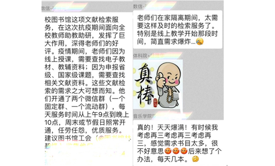 疫情期间,图书馆通过微信公众号、掌上文宝QQ咨询群、电话等为师生答疑解惑,及时解答读者在使用资源过程中遇到各种问题1000余条,其中微信后台536条,掌上文宝QQ咨询群300余条。