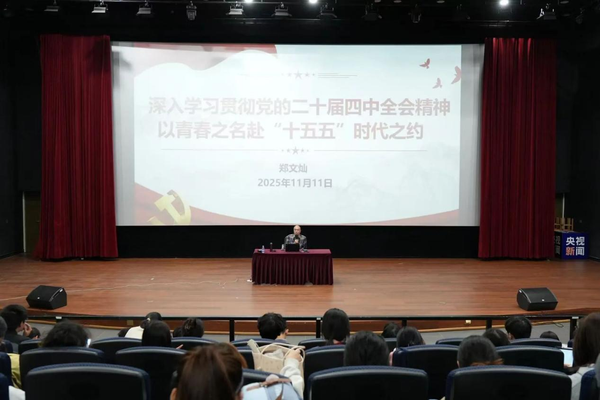 近日,传播学院党委书记郑文灿在星雨剧场讲授题为“深入学习贯彻党的二十届四中全会精神 以青春之名赴‘十五五’时代之约”的党课,学院全体党员、2025年下半年入党积极分子培训班全体学员到场学习。