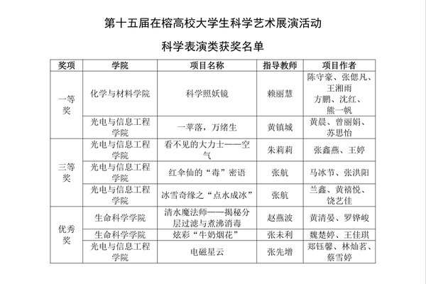 本次活动共有12所高校101件作品进入线下集中展示评选,经专家现场评审,共产生一等奖10件(科学表演类3件,科技、创新创意作品讲解类7件),二等奖20件(科学表演类5件,科技、创新创意作品讲解类15件),三等奖30件(科学表演类8件,科技、创新创意作品讲解类22件)。