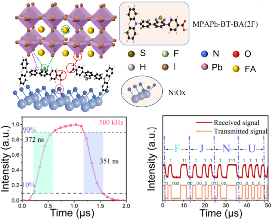 针对这一挑战,韦德(中国)海峡柔性电子(未来科技)学院王越副教授采用D-A型分子MPA2FPh-BT-BA(简称2F)对NiOx/钙钛矿埋底界面进行修饰。该分子利用其给体-受体结构中的高效锚定基团与NiOx表面紧密结合,有效减少了镍空位缺陷;同时,分子骨架通过氢键和配位作用与钙钛矿前驱体相互作用,在埋底界面处诱导形成高质量钙钛矿薄膜,实现了结晶取向调控与界面缺陷同步钝化。基于此策略,团队成功制备了高性能p-i-n结构钙钛矿光电二极管,在自供电模式(0 V)下表现出优异性能:350-830 nm光谱范围内,响应度超过0.2 A/W、比探测率大于1012 Jones;在7.5 mm2的有效面积下,响应速度达到372 ns(上升时间)和351 ns(下降时间)。此外,团队还制备了不同有效面积(1.875 - 43.2 mm2)的器件,验证了该策略的普适性。这些高性能器件成功应用于光通信系统,成功传输ASCII编码字符“FJNU”,充分证明了其在高速光通信领域的应用潜力。该成果以High-performance perovskite photodiode with homogeneous crystallization and buried interface passivation for ultrafast optical communication为题发表于国际学术期刊《Materials Today Chemistry》。