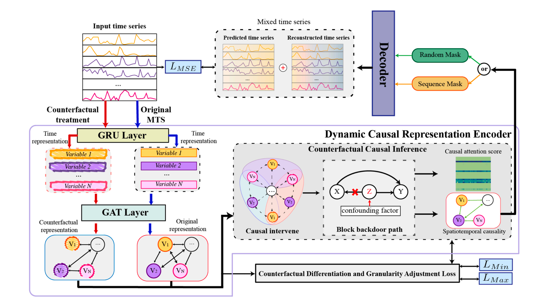 研究成果二:针对已有无监督多元时间序列异常检测方法难以有效地模拟复杂的时空依赖关系,存在着动态混杂因素干扰异常检测的挑战,提出了基于因果推断的细粒度依赖建模方法 SCID。该方法通过构建动态因果表示编码器,利用反事实干预剥离冗余影响因素,准确识别变量间的即时与延迟因果依赖;并引入预测-重构双掩码机制,将时序演化特征与局部结构特征联合建模,从而实现对复杂时空依赖的精细表征。同时,方法在优化目标中加入因果区分与粒度校正项,以缓解多变量粒度不一致带来的偏差,提高对复杂模式演化下异常信号的敏感度。实验结果显示,SCID 在五个真实数据集上取得领先表现,能够有效识别由隐含因果链条驱动的细粒度异常。该成果以“Fine-grained multivariate time series anomaly detection via causal inference”为题,韦德官方网为第一完成单位,第一作者为韦德(中国)2023级研究生陈祥炜同学(现为大连理工大学博士研究生),发表在国际知名期刊《Knowledge-Based Systems》上,该期刊属于中科院一区TOP期刊。