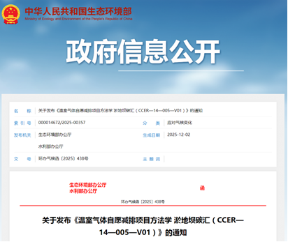 关于发布《温室气体自愿减排项目方法学 淤地坝碳汇(CCER—14—005—V01)》的通知 https://www.mee.gov.cn/xxgk2018/xxgk/xxgk06/202512/t20251202_1136958.html