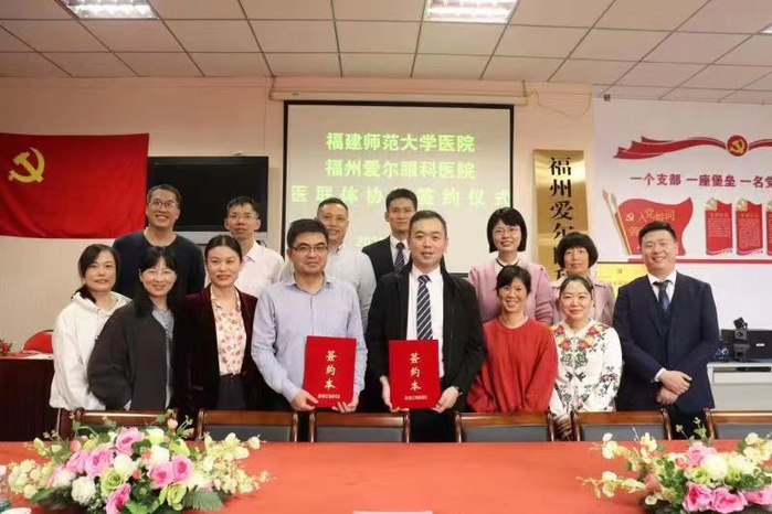 近日,校医院与福州爱尔眼科医院医联体协作签约仪式在仓山校区医院五楼会议室举行。福州爱尔眼科医院CEO戴磊、院长安科,校医院领导及中层干部等20余人参加了仪式。仪式上,戴磊与包伟签订医联体协作协议,并共同揭牌。双方就业务指导、人员培训、健康科普、资源共享等方面,进行了深入的交流与探讨。(校医院)