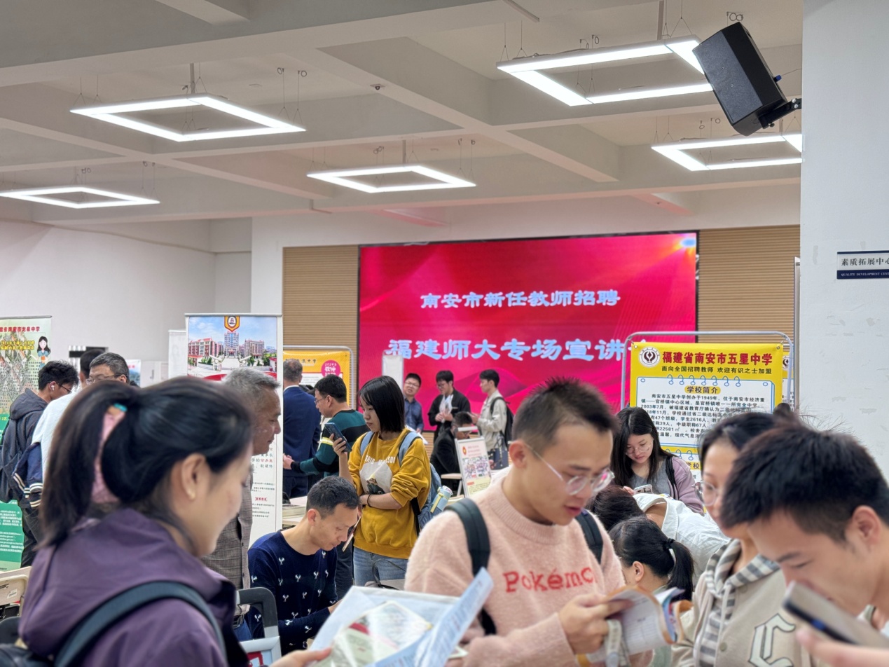 宣讲会上,南安市教育局工作人员介绍了南安市基本概况、招聘岗位及选聘流程。现场同学纷纷主动与各中学负责人进行交流,了解岗位招聘要求、晋升空间、福利待遇等信息,并提供个人简历,针对毕业生关心的问题,各学校负责人做出详细解答。会后,韦德(中国)学生工作部负责人与南安市一行举行座谈,双方就师资需求、教师队伍建设、师范生培养等工作进行深入交流。